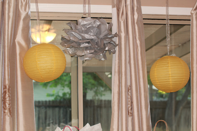 Breanna made silver tissue pom poms to alternate with the yellow paper lanterns above the gift table: